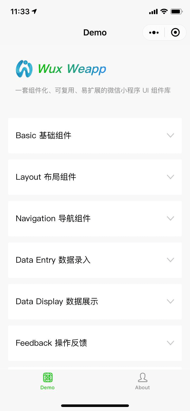 packages/ 目录下对应组件(如 actionsheet)拷贝至 demo 目录;index.json 是否存在依赖组件,若存在则一一拷贝;index.js 文件中),是则拷贝 index.js 文件,并删除不需要的组件引用;index.js 是否存在对帮助方法的引用,若存在则拷贝 helpers 目录(抑或直接拷贝不管是否存在引用)。您可以扫描下方的小程序码体验或用 微信web开发者工具 打开 example 目录(请注意,是 example 目录,不是整个项目)。